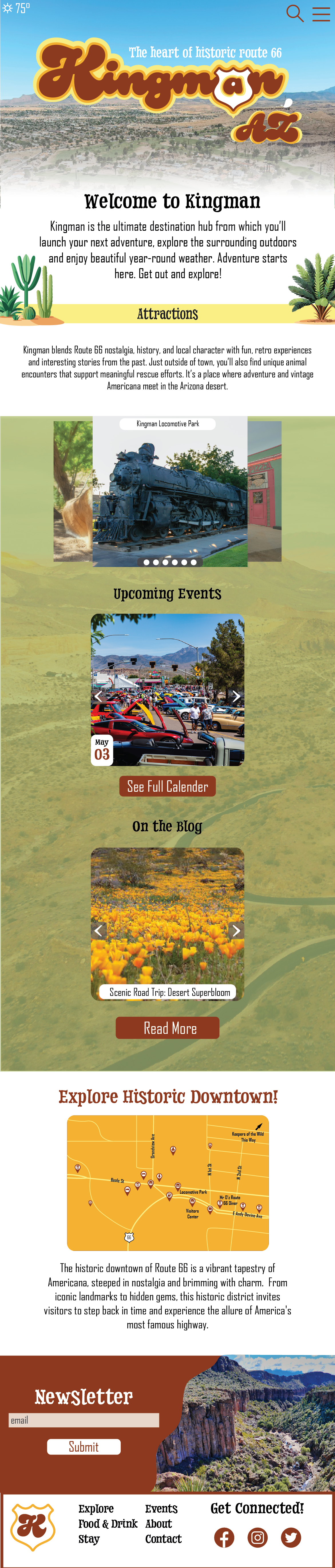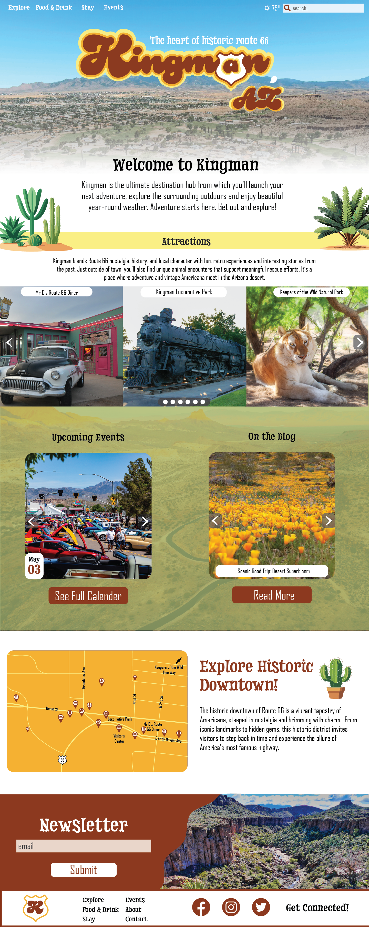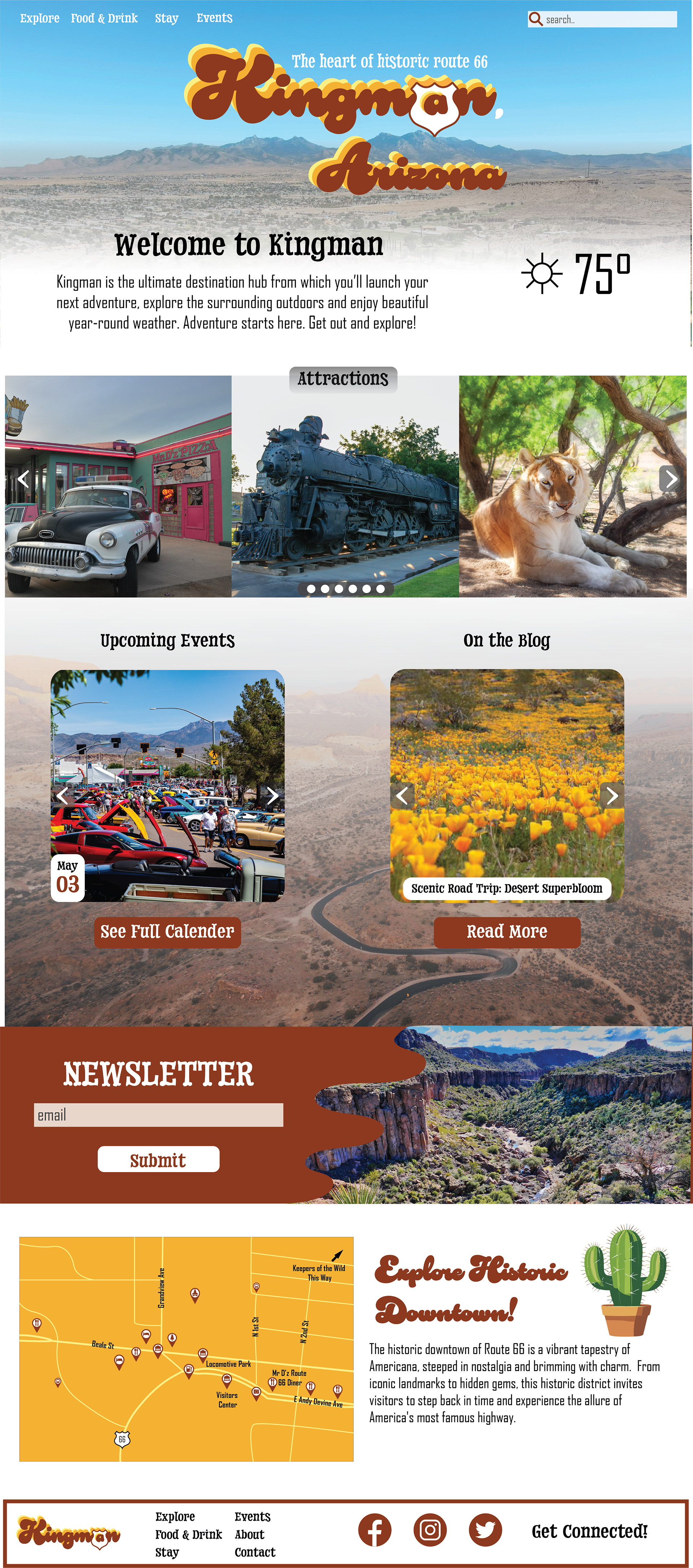 For my actual mockup, I reused a lot of imagery and fonts to keep it consistent with the brochure I created. It mostly consists of carousels, showing the different attractions, events, and blog posts. I included the map and a place to sign up for the newsletter, too.
