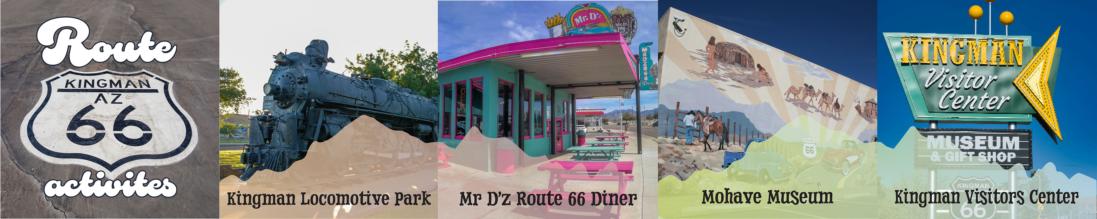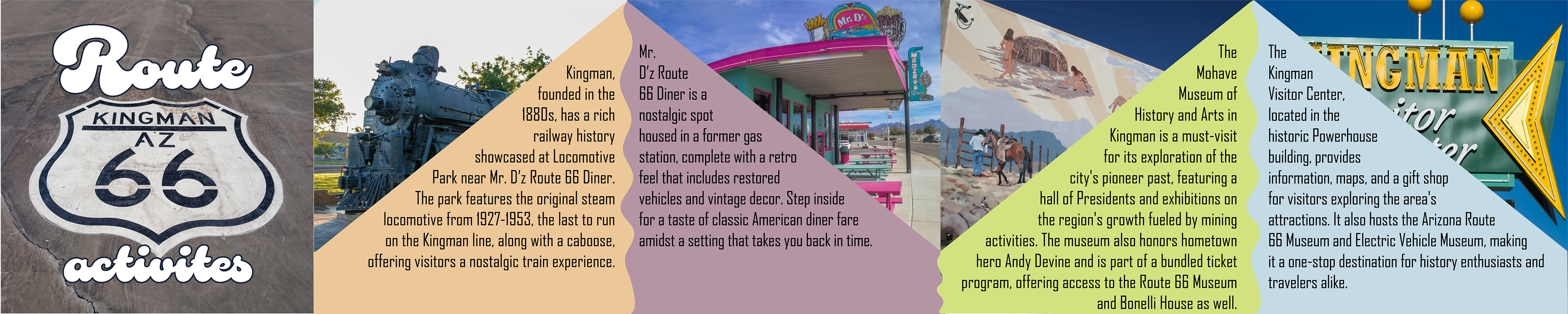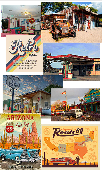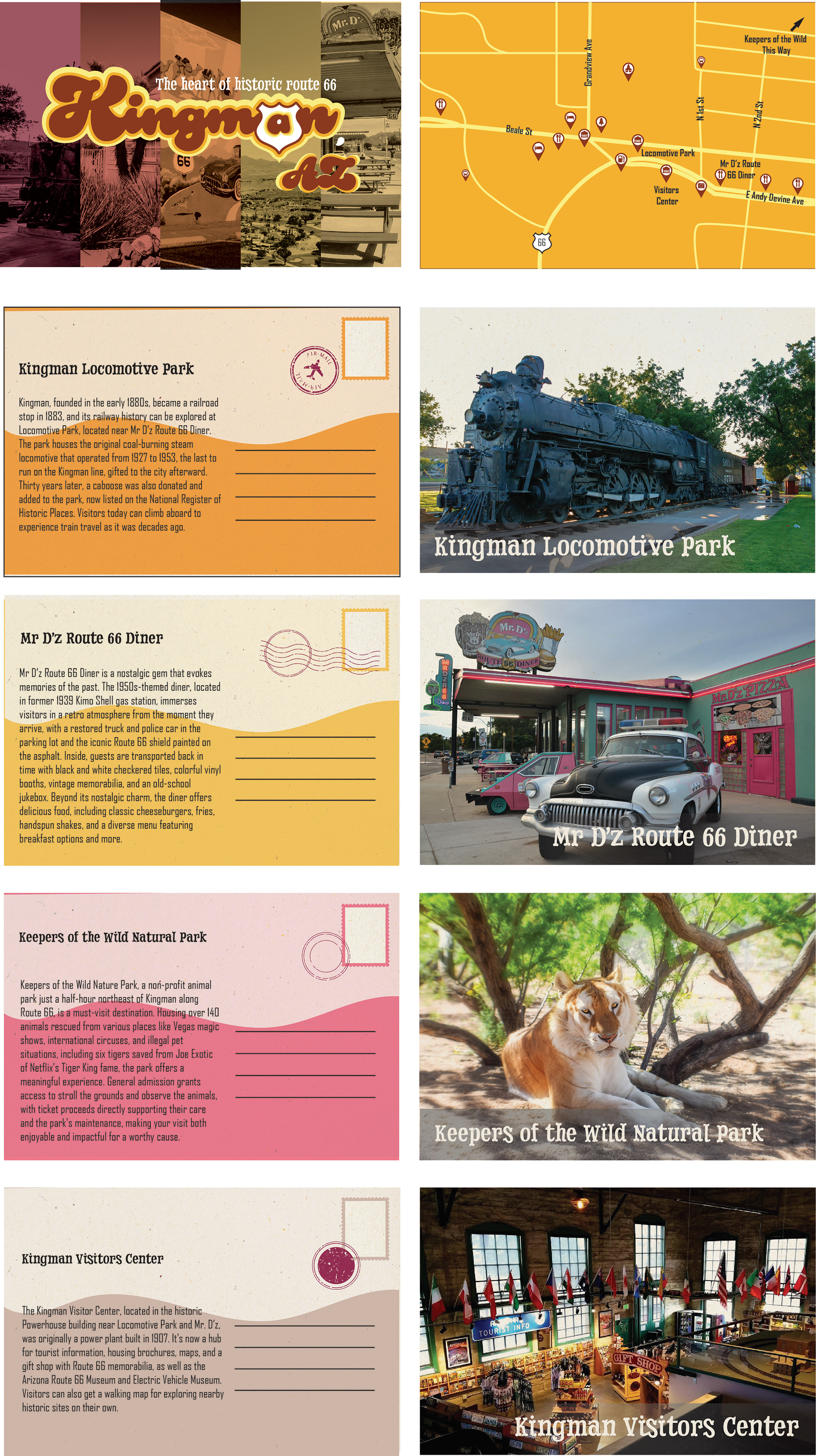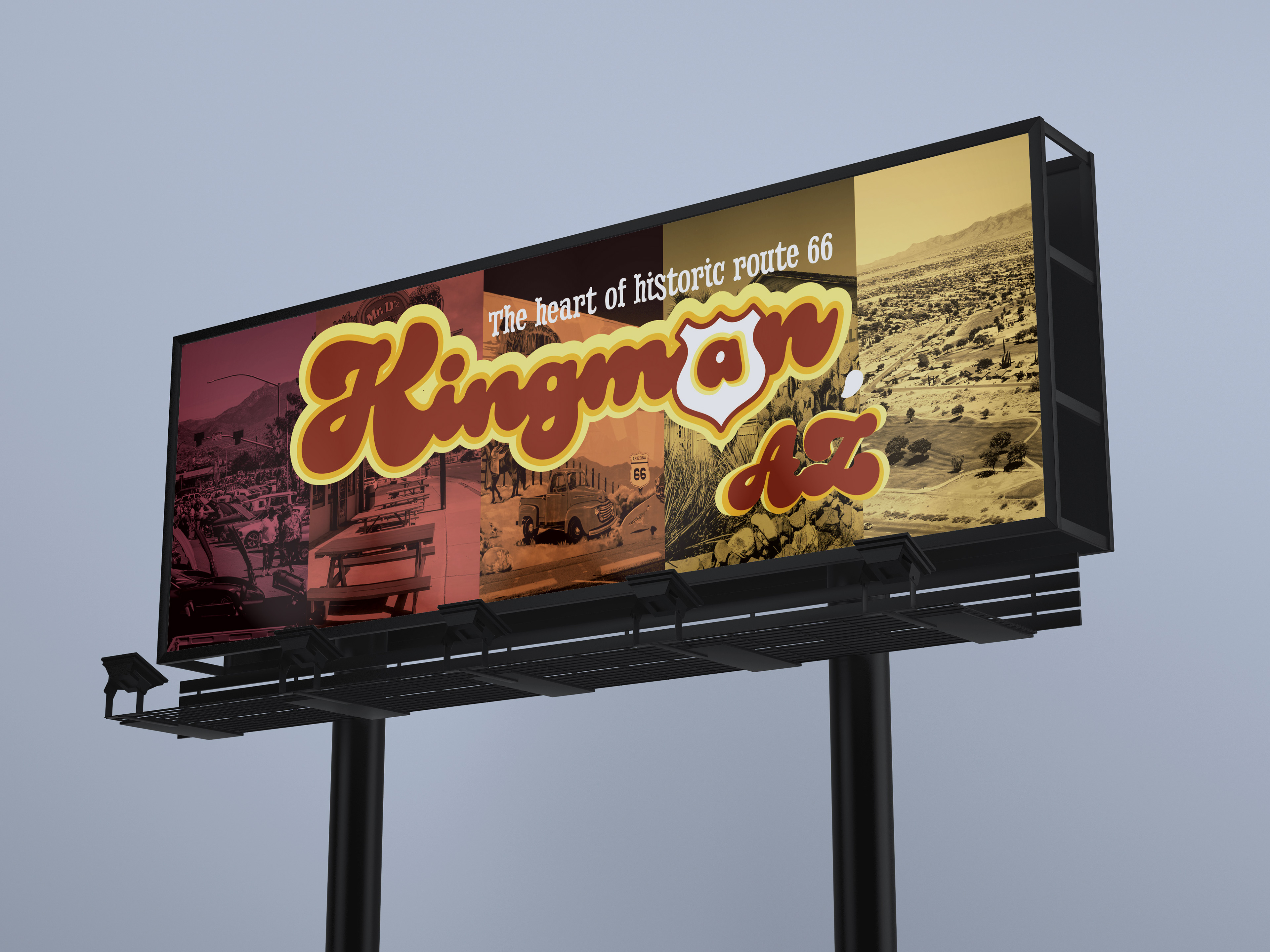 Because Kingman is located along Route 66, I wanted to lean into a retro desert vibe. I pulled imagery of old rusted gas stations and classic cars to set the tone. A groovy 70s-style font and bright colors also helped reinforce the look I was going for.
